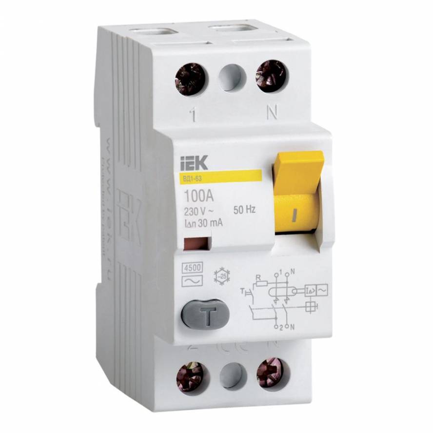 УЗО IEK на 25 А. Кнопка «Тест» здесь имется серого цвета и крупных размеров