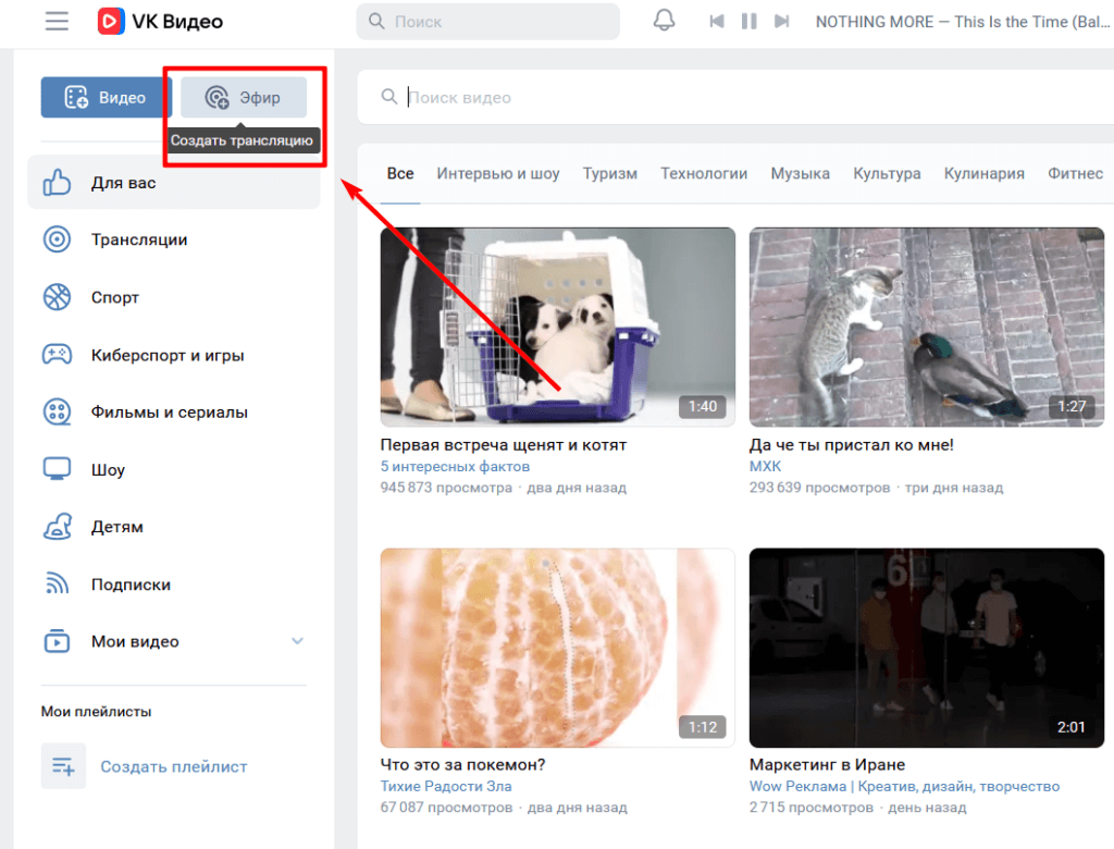 - В правой верхней части раздела видеозаписей нажмите кнопку «Трансляция»