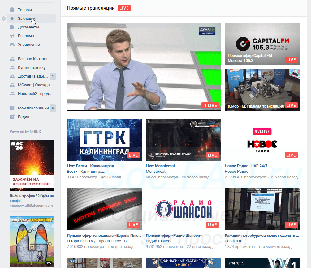 Если вы заходите в социальную сеть через мобильный телефон (см. приложение вконтакте для андроид), то для вас есть небольшое преимущество. Есть возможность выбирать категории онлайн трансляций.