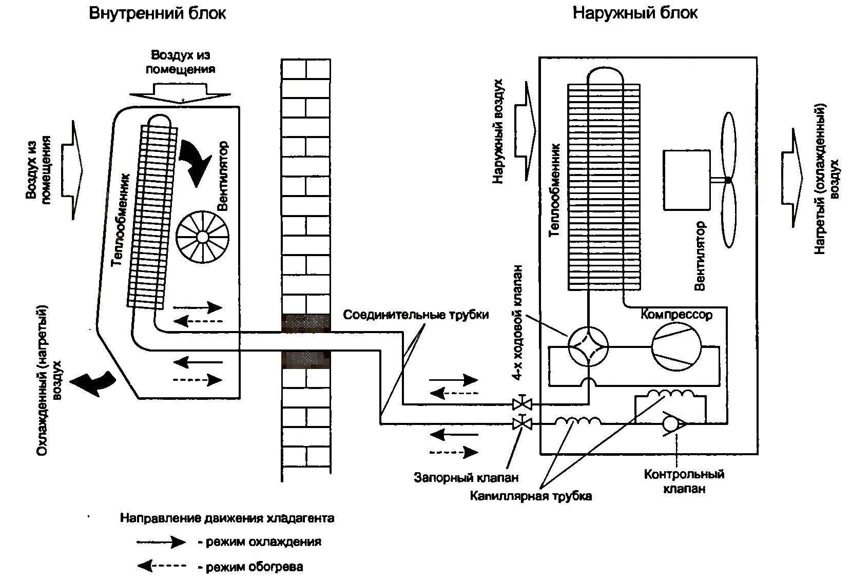 На рисунке изображена принципиальная схема кондиционера. При этом один блок, оснащенный испарителем, находится внутри помещения. А второй, с конденсатором, — снаружи. Что позволяет сделать процедуру теплообмена максимально эффективной. Кроме того, в блоке, который находится на улице, всегда размещается компрессор, который является самой шумной частью конструкции