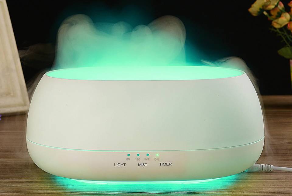 - Подсветка корпуса, в которой каждый цвет соответствует определённому уроню влажности в комнате. Например, фиолетовый цвет сообщает пользователю, что уровень влажности не превышает 70%. Как только этот порог будет превышен, подсветка изменится на голубую. Таким образом, владелец может определить необходимость изменения режима интенсивности испарения или отключения прибора. Оговоримся, что смена цветовой индикации имеет погрешности, поскольку встроенный гигрометр анализирует уровень влажности вблизи устройства, что не всегда совпадает с уровнем влажности во всём помещении.