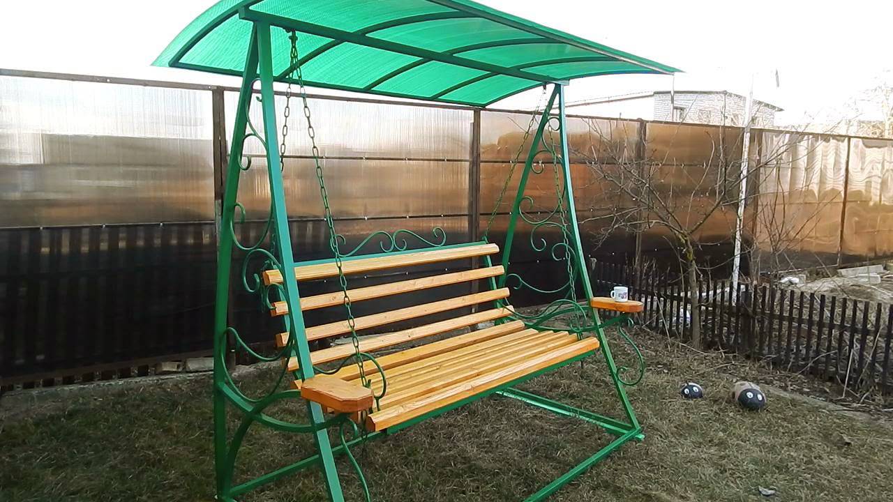 Каркас для садовых качелей можно сделать из профильной трубы с помощью сварки Металлическая рама качелей более прочная, чем опора из дерева. Костяк делают из четырех стоек, часто внизу их соединяют дополнительными профилями. Такие изделия могут выдерживать двух-трех взрослых, если сделать удлиненное сиденье. Общий вес, которым можно нагружать качели, составляет от 240 до 275 кг.