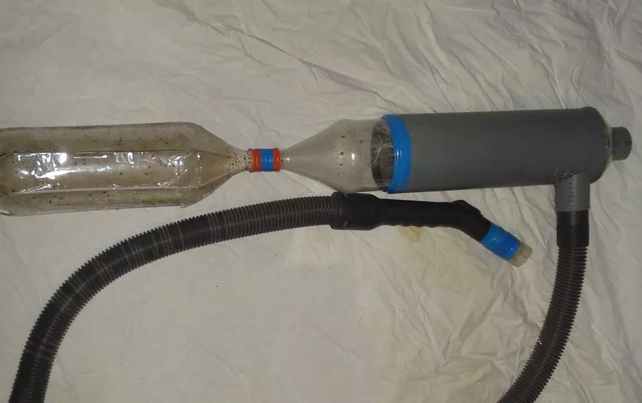 Совет! Подобной конструкции получится пылесос из пластиковой бутылки, где емкость используют вместо куска толстой трубы. Однако у такой конструкции имеется недостаток. Мягкие стенки бутылки во время работы могут сминаться, что усложняет уборку.