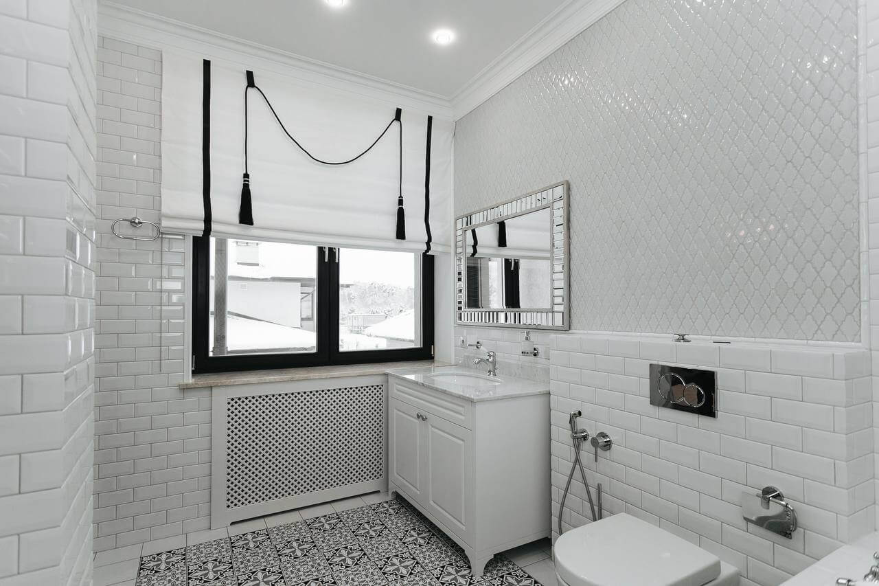 Благодаря римской шторе интерьер ванной стал интереснее, а текстура ткани смягчила глянец плитки. Студия текстиля «Олита»