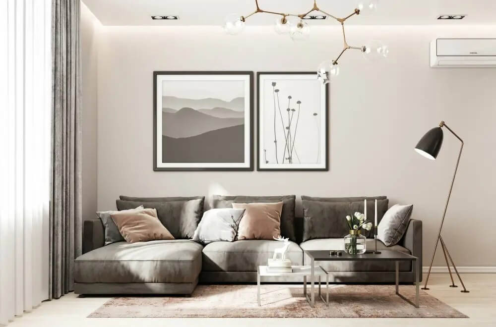 Самым безупречным вариантом будет гамма серого и бежевого оттенков. На этом фоне можно будет дозировано использовать какие-то яркие аксессуары, если вам этого захочется.