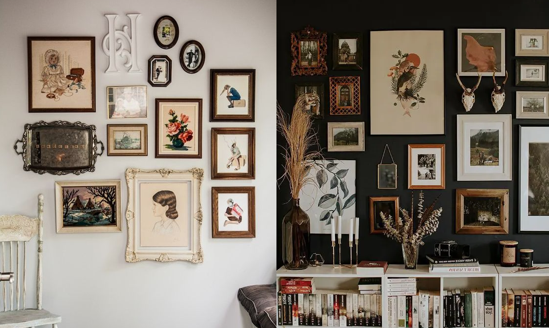 Необязательно собирать целую коллекцию шедевров. Можно повесить на стену всего один, но крупный арт-объект, который станет точкой притяжения взгляда. Или пойти другим путём и подобрать для авторского творения множество интересных бюджетных соседей. Ведь не каждый объект на стене должен быть картиной, это могут быть семейные фотографии, зеркала, гербарии, обложки пластинок, театральные афиши, красивые тарелки, старые медные подсвечники и даже пустые рамы.