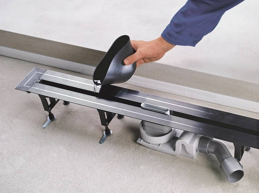 В канавку укладывается труба и одним концом подсоединяется к трубе канализации. К другому концу трубы присоединяется сифон с водяным затвором и элементами сливной решетки. Все места соединения сливной трубы необходимо покрыть силиконовым герметиком для повышения надежности соединений.