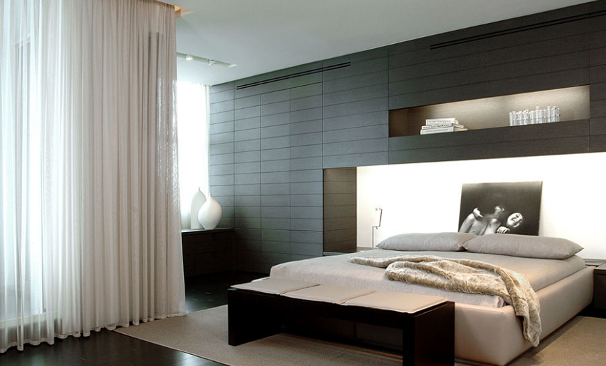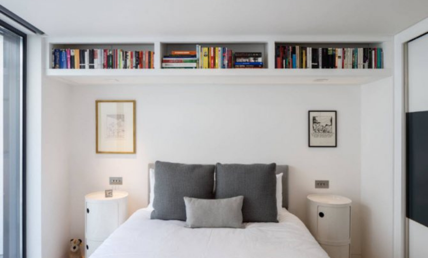 Пространство над изголовьем кровати тоже можно использовать для хранения, если сделать в стене нишу — она вполне может выполнять функцию полки.