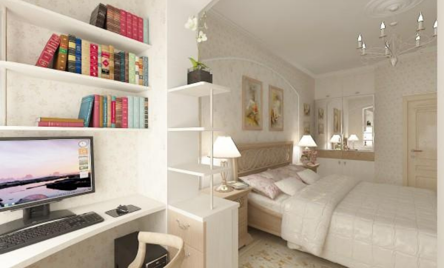 В настоящее время многие используют комнату отдыха в качестве рабочего места. Для этого следует определить границы каждой из зон с помощью стеллажей для документов и книг, мебелью-траснформером, шкафом, откидной крышкой письменного стола или шторкой.