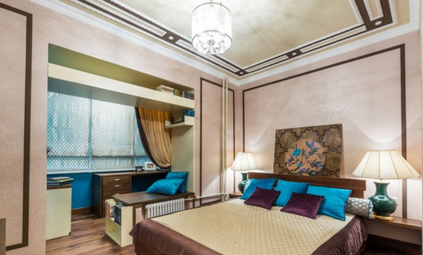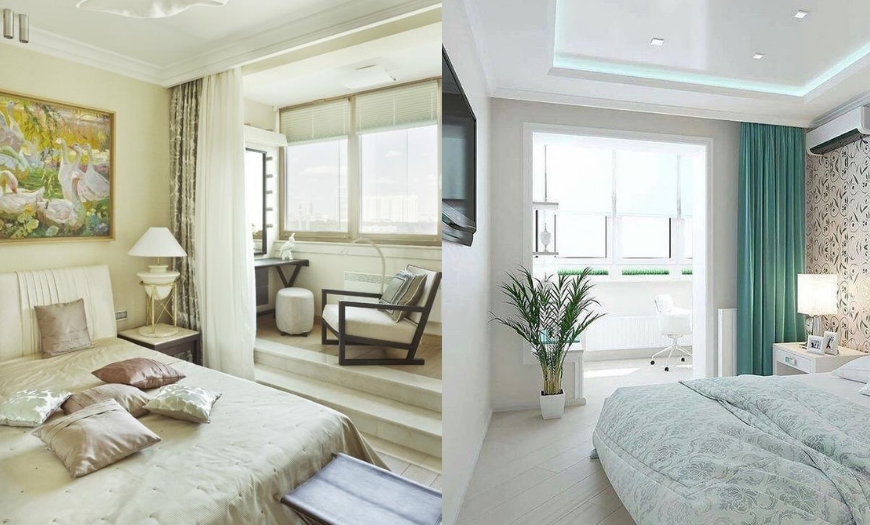 При присоединении лоджии или балкона к спальне достаточно просто убрать оконную раму и дверь. В образовавшемся проеме оборудуют дополнительный стол. Лоджию утепляют. Там можно сделать небольшой рабочий уголок.