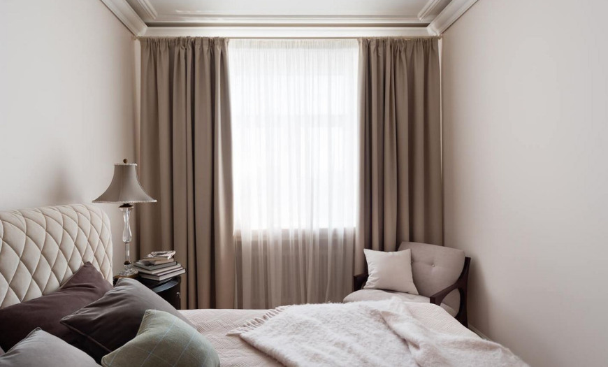 Шторы в маленькую спальню не должны быть очень громоздкими, и иметь сложную многослойную конструкцию. Дизайнеры рекомендуют компактные рулонные шторы либо классические комплекты из легких тюлевых гардин и портьер из плотных, но легких натуральных полотен.