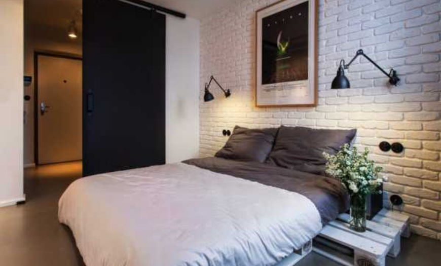 Чтобы разбавить цветовую палитру, одну из стен в спальне можно выделить другим цветом или материалом. Благодаря этому простому решению интерьер вашей комнаты сразу преобразится. Например, оклейте одну стену обоями, если все остальные сделаны под покраску. Или отделайте стену искусственным камнем или кирпичом. Другой, более нестандартный вариант — ламинат на стене.