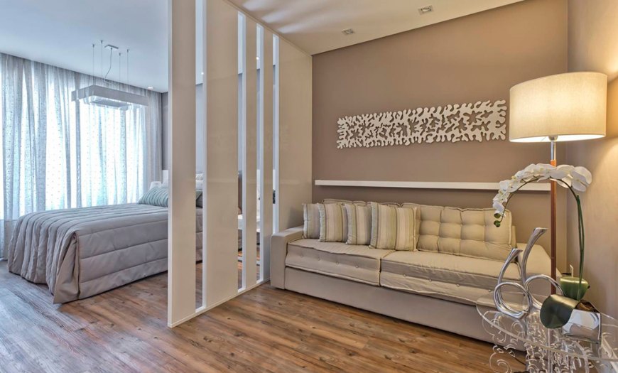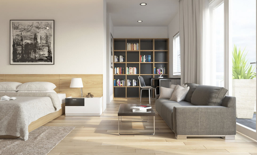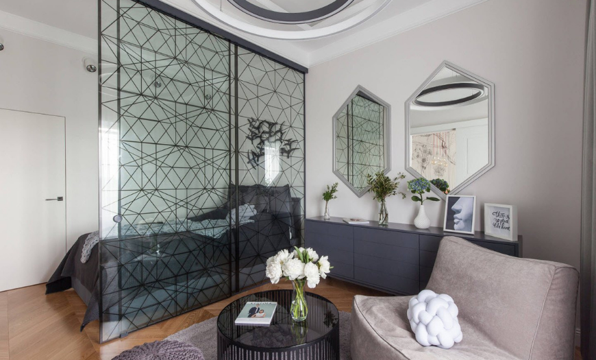 Первый вариант – объединить спальню с гостиной. Получится просторная комната с гостевой зоной и зоной для сна. Отделить их можно с помощью: