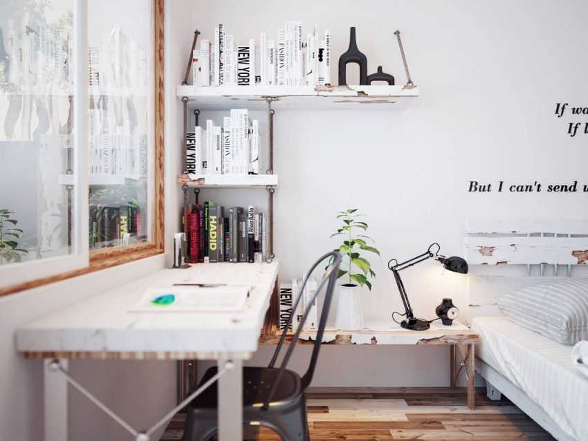 - Бюджет минимален, тогда замените приобретение штор на «рулончики» или подходящие современные жалюзи. Мягкую мебель можно всегда поискать на распродаже. Что касается организации рабочего пространства, то столом можно заняться самостоятельно, создав стол и стеллажную конструкцию в стильной интерпретации;