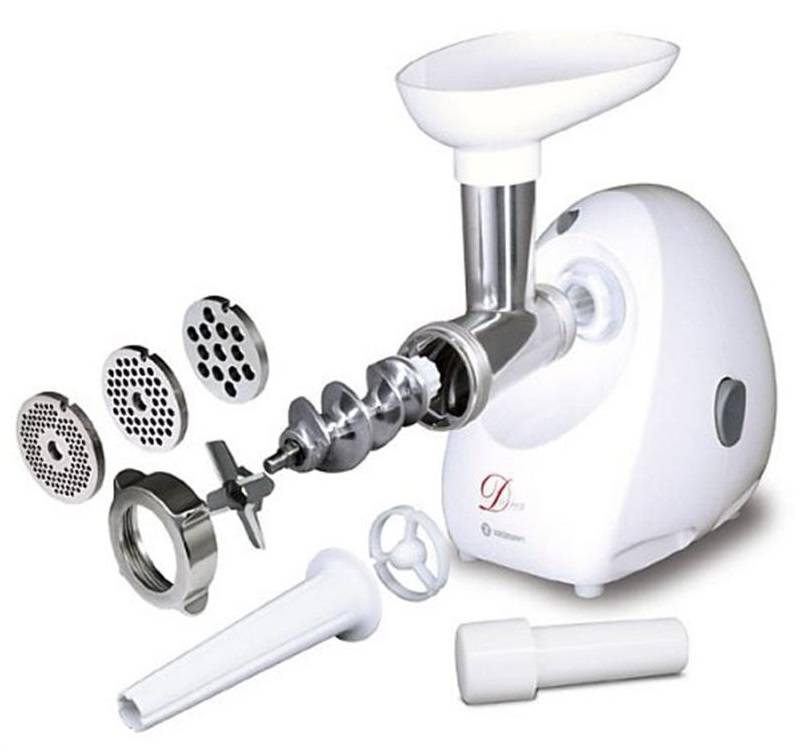 В отличие от механических моделей, электромясорубки оснащены электрическим приводом. Отличаются привлекательным дизайном, большими габаритами и простотой в эксплуатации. Рассмотрим устройство, составные части, дополнительные элементы, расширяющие возможности прибора, более подробно.