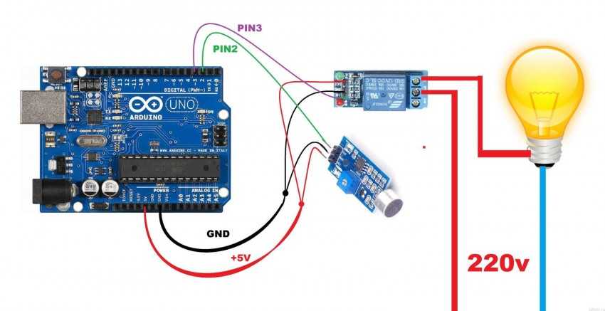 - далее сработает реле, замкнув цепь. К цепи можно присоединить разную нагрузку. Один из концов релейного контакта подключается к сети напряжением 220 В, а второй – к осветительному прибору.