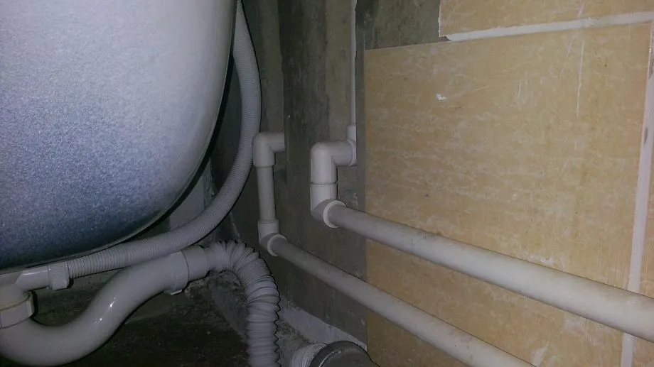 Вместо гофры, соединяющей сифон с системой канализации, используется гладкостенная труба серого цвета.