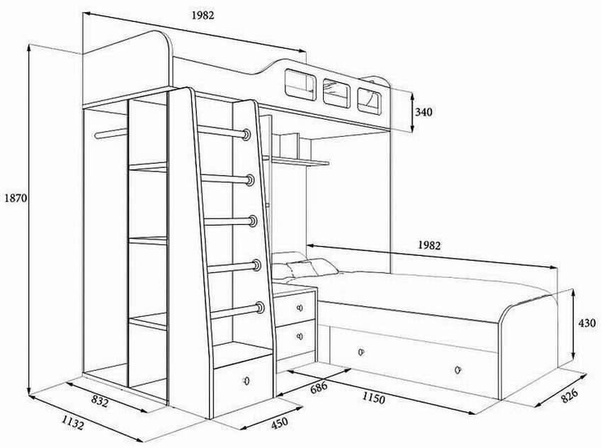 В малогабаритных квартирах вполне уместен комбинированный вариант, когда нижнее место предусмотрено для родителя, а верхнее – для ребенка. Кроме того, существует масса вариаций чердачного типа, которые подходят и для детей и для взрослых. Если имеется необходимость, вполне реально соорудить конструкцию с парой двуспальных мест, для размещения гостей.