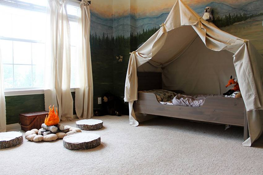 Над кроватью — балдахин натягивается над спальным местом или располагается по центру. Такая конструкция называется шатром и используется для защиты ребенка от внешних воздействий.