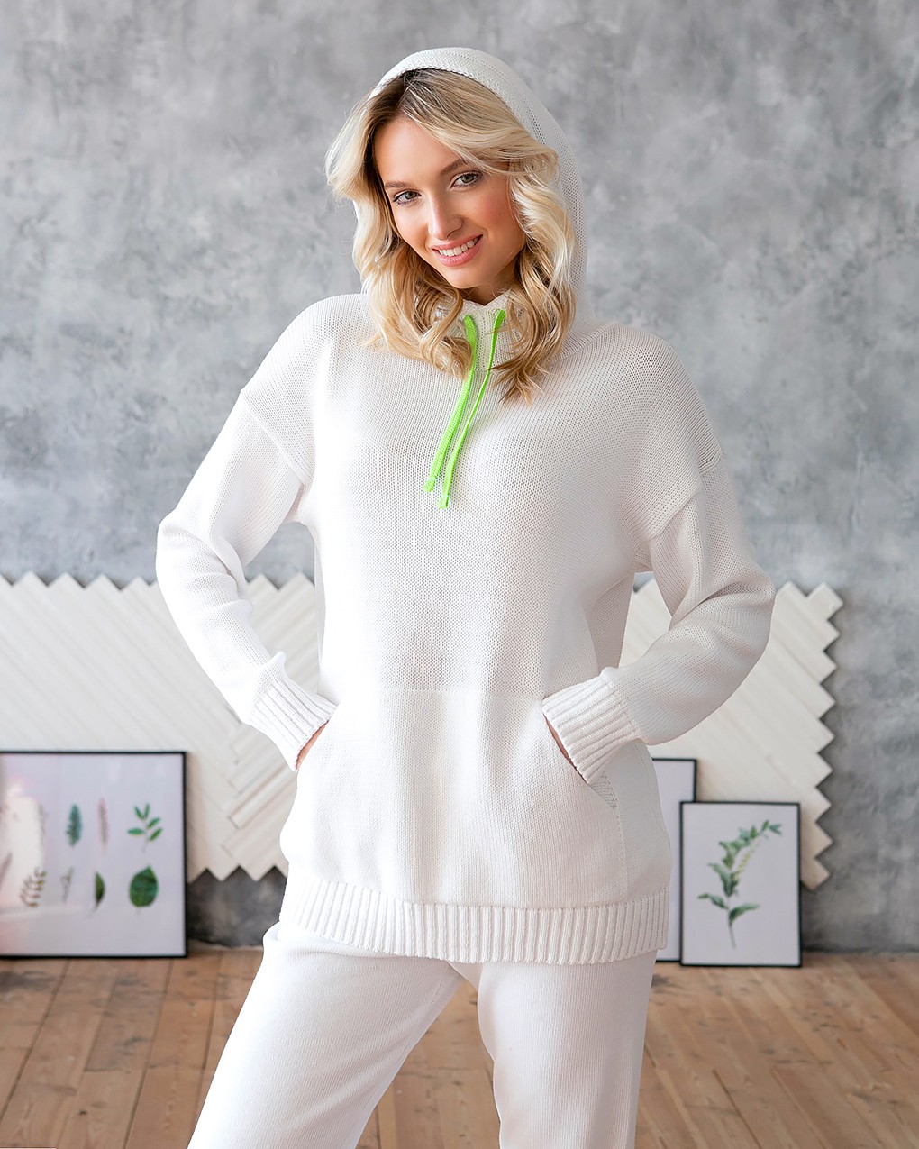 - Вязаный трикотаж. Именно такой, а не тканный используется при пошиве худи. Изделие выглядит по-домашнему уютно, но в то же время эффектно.