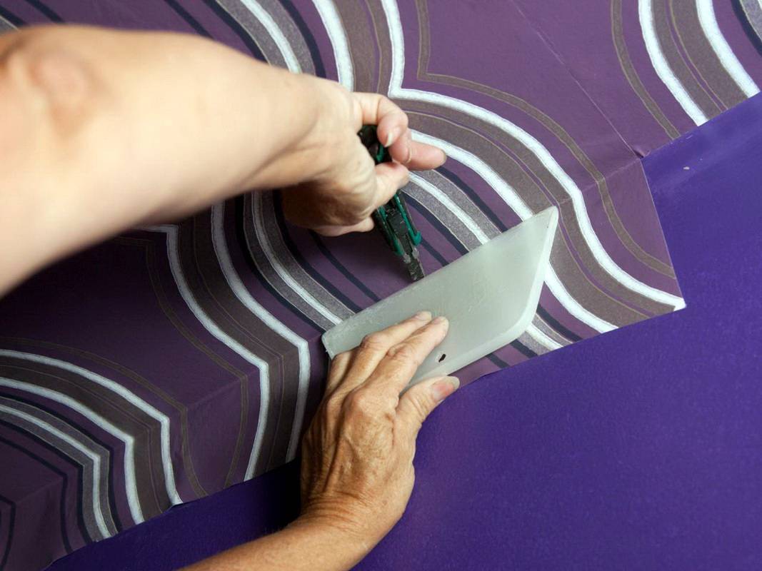 - С помощью острого ножа аккуратно разрежьте пузырь по всей длине, промажьте обои клеем и прижмите валиком.