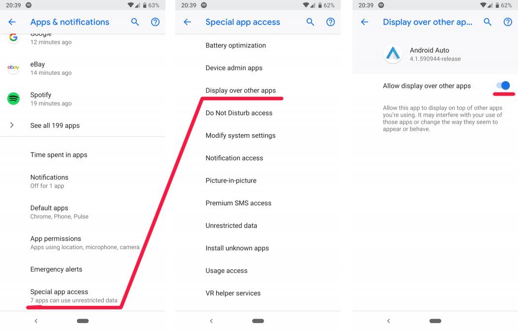Если это не решает проблему, следующим шагом является проверка того, какие приложения имеют разрешение на отображение поверх других приложений. Выберите «Настройки»> «Приложения и уведомления»> «Дополнительно»> «Доступ к специальным приложениям»> «Отображать поверх других приложений». Здесь вы увидите все установленные приложения, которым вы дали разрешение отображаться, даже если вы их не используете.