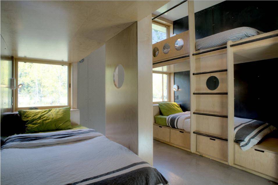 Для троих детей применяют компактные кровати-трансформеры с выдвижным дополнительным блоком или модели с раскладным диваном, располагающимся на первом ярусе. Если предполагается размещение четырех ребятишек и более, то размер ложа должен быть двуспальным и иметь лесенки с двух сторон, невысокие поручни и перила.