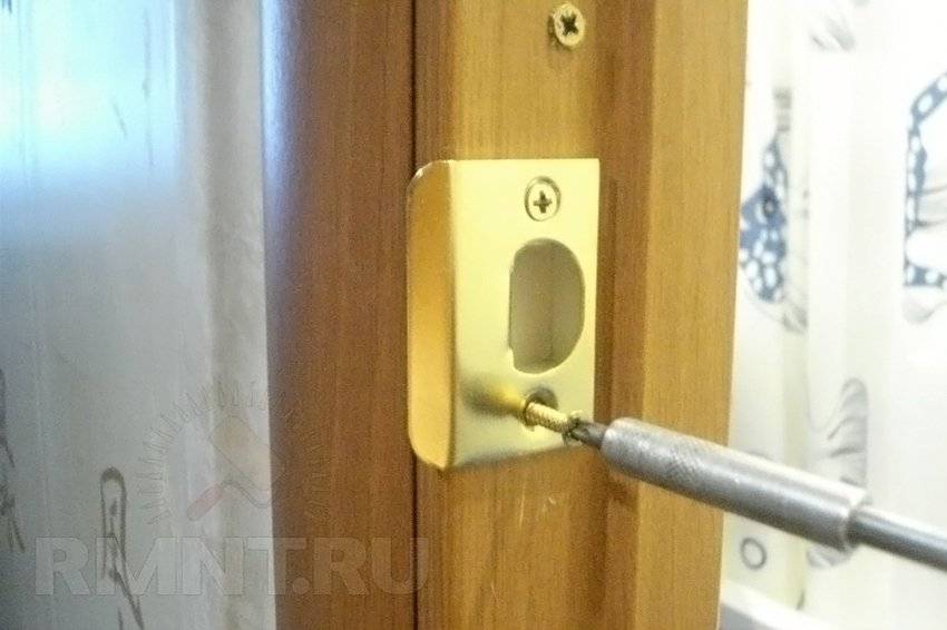 Финальный этап установки, как и в предыдущих случаях, подразумевает монтаж ответной планки на дверную коробку. Стоит запомнить, что она устанавливается только после выполнения отверстия для язычка и саморезов.