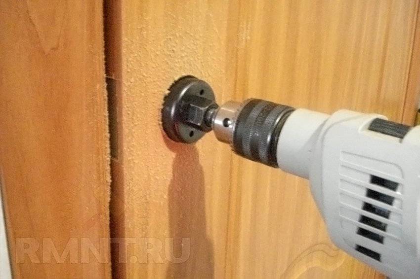 4. Высверливаем с помощью коронки диаметром 50 мм сквозное отверстие. Делать это лучше с двух сторон двери во избежание повреждения дверного покрытия на выходе коронки при сверлении.