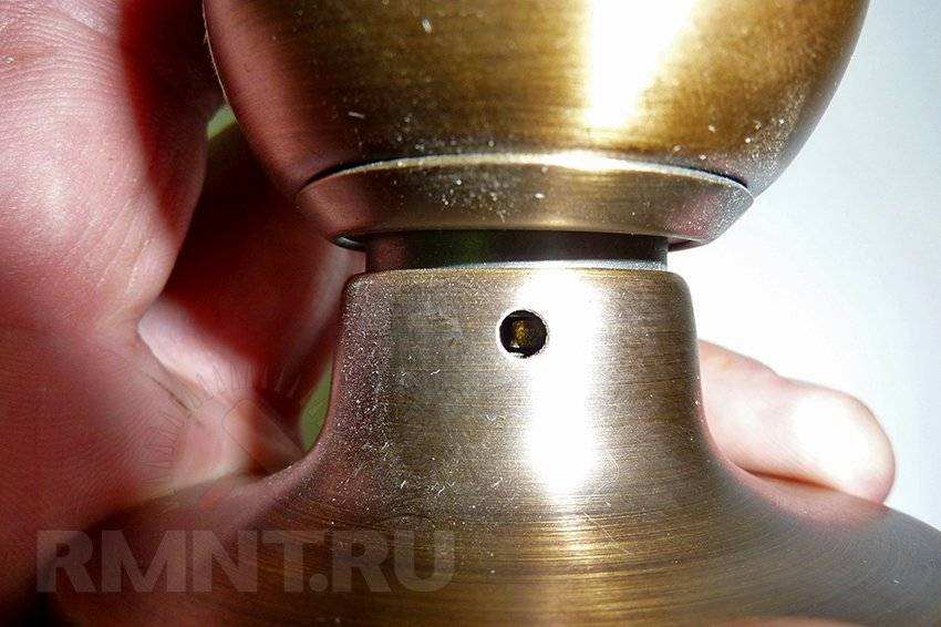 Технология монтажа круглых дверных ручек (кнобов) отличается от процесса установки нажимных изделий. Это связано с конструктивными особенностями подобной фурнитуры. Монтаж ручки может производиться как на снятом, так и на навешенном полотне. Второй вариант является более приемлемым, так как упрощает разметку ответной планки на дверной коробке.