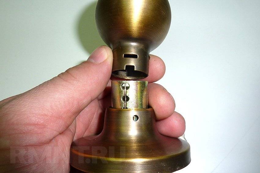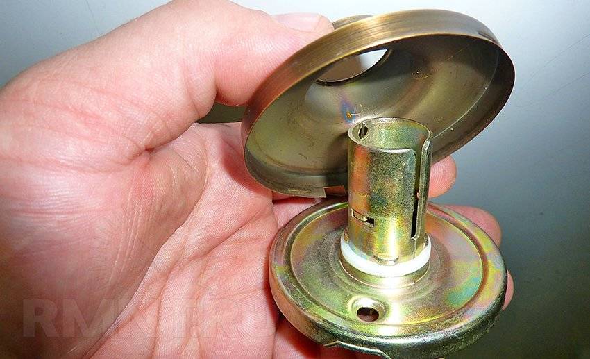 После организации всех необходимых отверстий можно приступить к установке ручки в межкомнатную дверь. Однако для начала необходимо зафиксировать посредством саморезов защелку. Для крепления круглого изделия нужно разобрать его верхнюю часть и убрать декоративное кольцо.