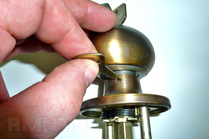 - При помощи входящего в набор ключика (можно взять любой другой тонкий плоский предмет) нажимаем внутри отверстия на язычок и снимаем вверх саму ручку.