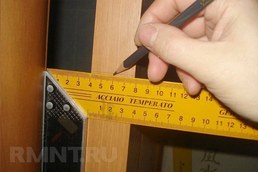 Ответную часть надо установить четко, чтобы двери не люфтили и не было проблем с закрыванием. Поэтому стараемся отмечать как можно точнее и берем остро отточенный карандаш.