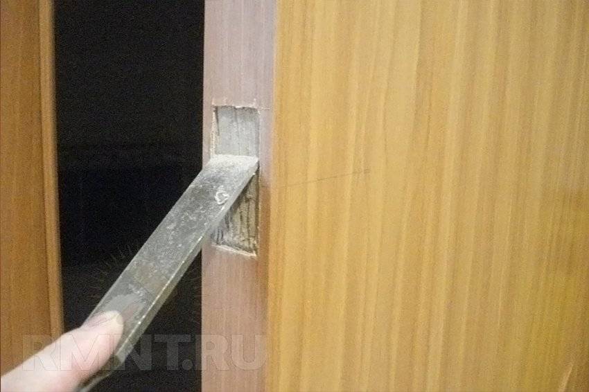 - С помощью стамески и молотка в торце дверного полотна делают углубление под лицевую планку. Она должна полностью входить в дверь.