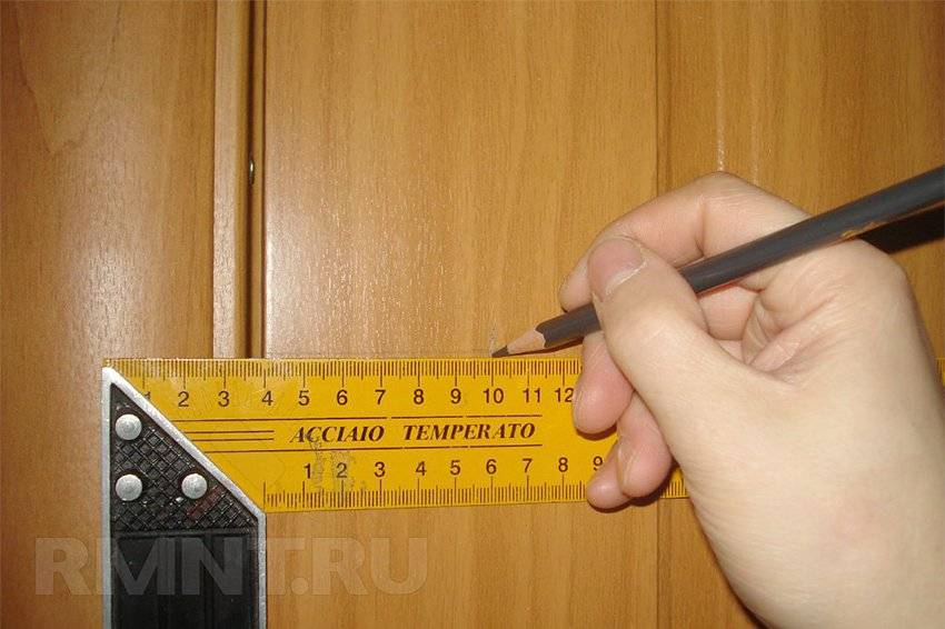 - Прикрываем двери так, чтобы язычок защелки уперся в косяк. Отмечаем положение защелки карандашом (сверху и снизу).