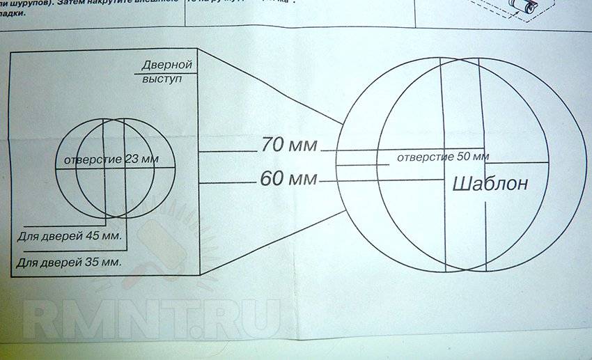 1. Процесс установки начинаем с нанесения разметки на дверном полотне под сверление. Схема разметки, как правило, идет в комплекте вместе с ручкой.
