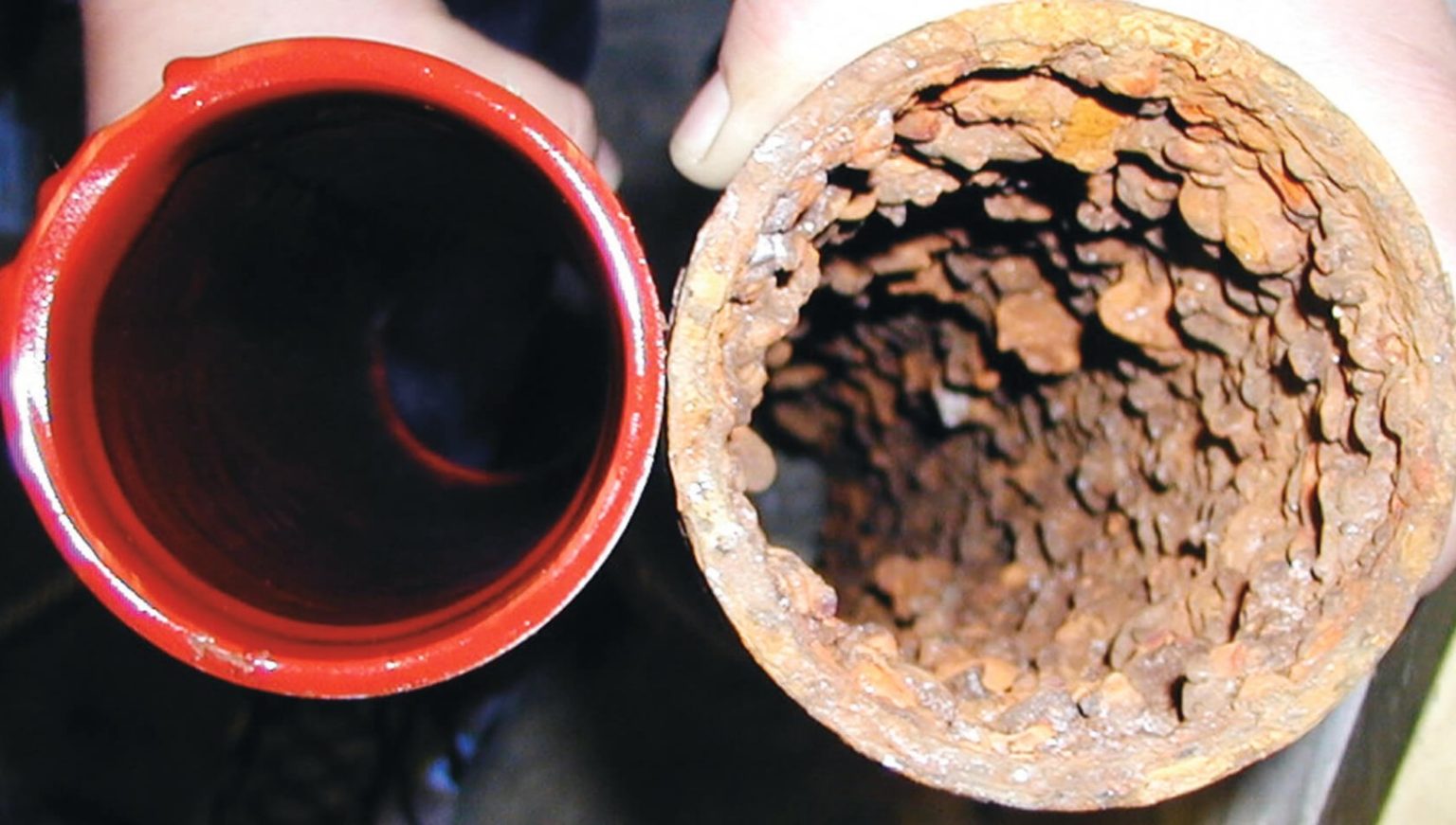 В первом случае чугун имеет свойство собирать налет и ржавчину внутри трубы. Из-за коррозии стенки становятся неровными, что содействует сбору отходов. Нередко при их демонтаже с диаметром 110 мм проходимость составляла с мизинец (2–3 см).