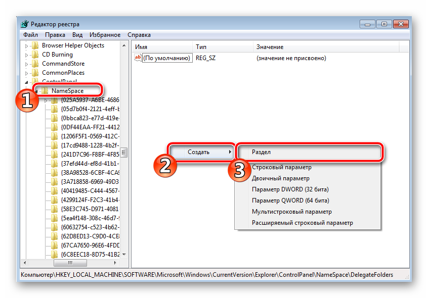 HKEY_LOCAL_MACHINE\SOFTWARE\Microsoft\Windows\CurrentVersion\Explorer\ControlPanel\NameSpace В папке NameSpace на любом пустом месте нажмите правой кнопкой мыши и создайте новый раздел.