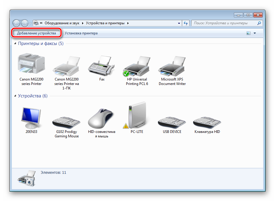 Операционная система Виндовс имеет несколько встроенных инструментов, позволяющих работать с печатным оборудованием. Процесс установки принтера через штатную возможность был рассмотрен в статье об инсталляции драйверов, ссылка на которую указана в первом методе. Однако иногда такая функция не подходит и принтер не устанавливается. Тогда нужно воспользоваться инструментом «Добавление устройства». Через «Панель управления» перейдите в раздел «Устройства и принтеры», там нажмите на соответствующую кнопку и следуйте отобразившимся на экране инструкциям.