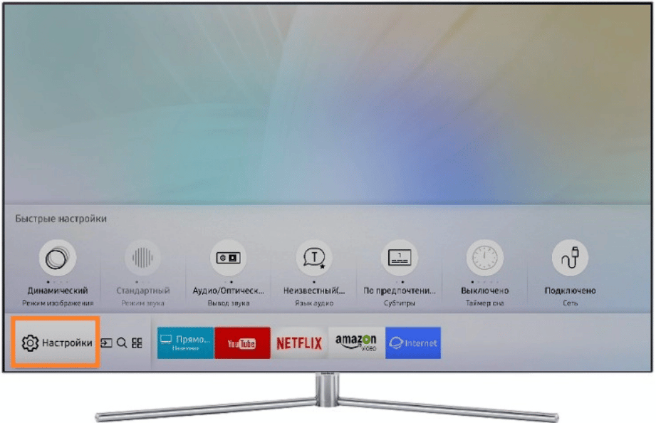 Нажмите кнопку «Домой» на пульте Самсунг, затем выберите «Настройки».