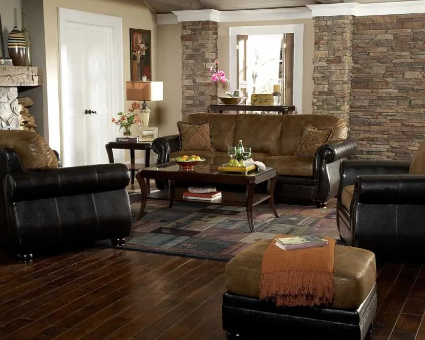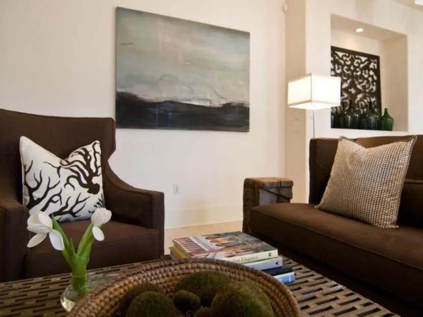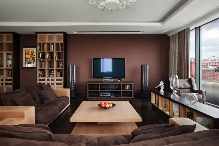 Интерьер гостиной с коричневым диваном может выглядеть по-разному, в зависимости от цвета мебели и обивки. Все разнообразие оттенков коричневой гаммы можно разделить на следующие группы: