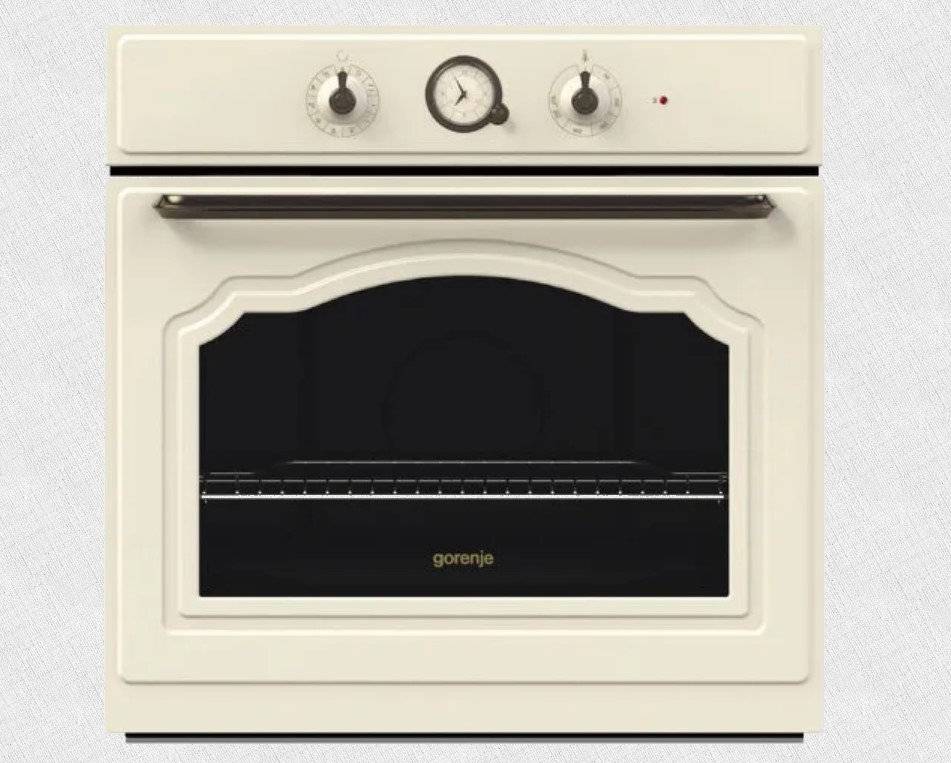Электрический духовой шкаф в винтажном исполнении бежевого цвета. Объем – 65 литров. Расход – А. Размеры — 59,5*59,7*56,5 см. Управление – механические регуляторы. Дисплея нет. Есть конвекция, гриль, Звуковой таймер, может разморозить продукты. Очистка – гидролизная. Дверца с тремя стеклами. Аналоговые часы. Цена – от 26 тысяч рублей. (2 магазин, 3 магазин, 5 магазин).