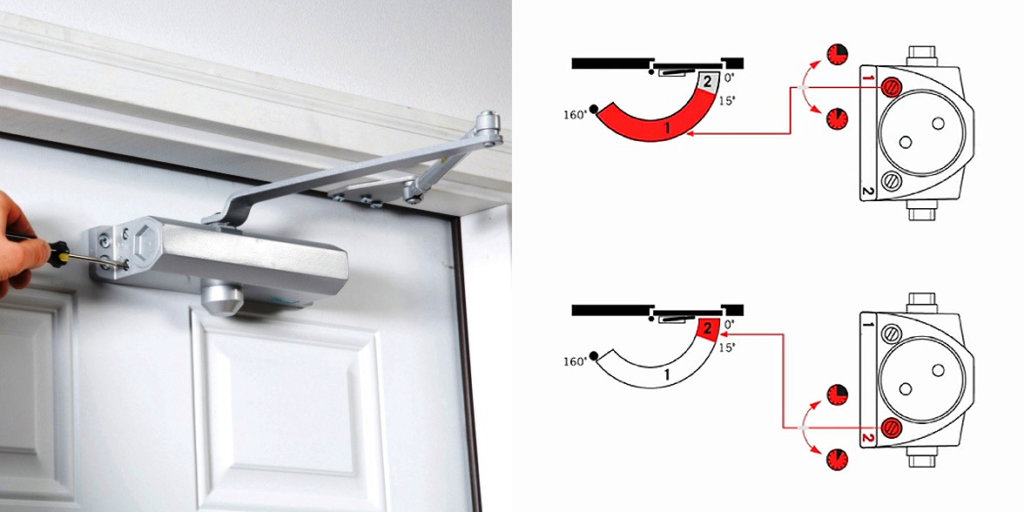 После того как доводчик будет установлен, его необходимо отрегулировать. Способ настройки зависит от расположения регулировочных винтов, которые могут располагаться как с торца корпуса, так и внутри него. Обычно винты обозначаются цифрами 1 и 2, где «единица» отвечает за изменение угла открытия двери относительно короба, который может достигать 180 градусов, а «двойка» – за скорость, с которой дверь будет закрываться. Первым настраивается угол открытия. Для этого устанавливают нужное значение, которое может варьироваться от 90 до 180 градусов, после чего переходят к регулированию скорости движения полотна.