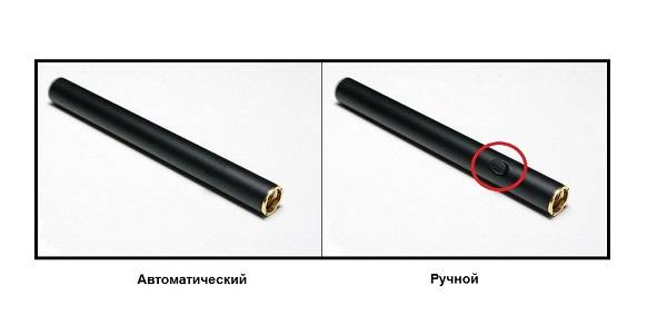 По типу управления все виды электронных девайсов делятся на автоматические и ручные. Автоматические используются на одноразовых моделях и сигаретах класса «мини» или «пенстайл». Устройство запускается с каждой затяжкой, при этом активируется датчик тяги, импульс, передаваемый от микропроцессора, на вдохе зажигает светодиод (расположен там, где у обычной сигареты находится уголек). Автоматические сигареты очень просты и удобны в использовании. Отсутствует необходимость производить какие-либо настройки, нажимать кнопки — ингалятор можно просто курить, как обычную сигарету.