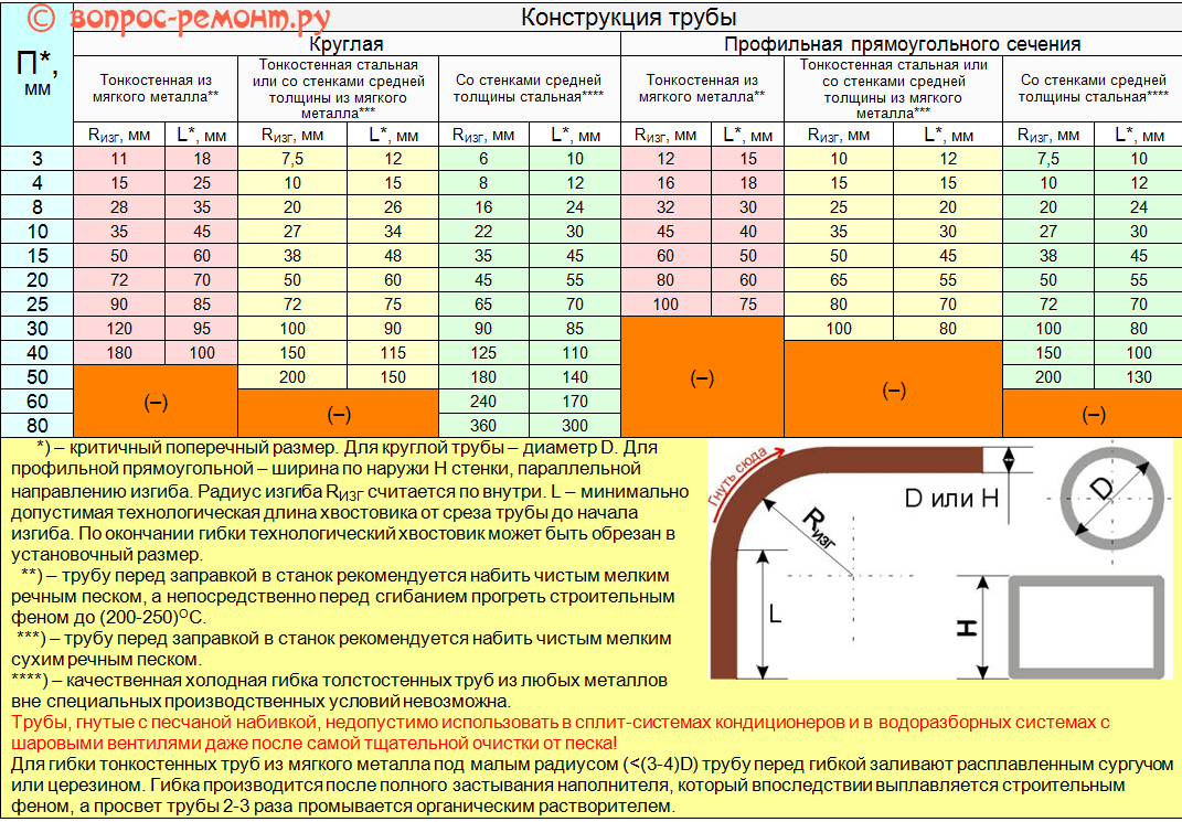 Правила выбора радиуса изгиба трубы RИЗГ и длины технологического хвостовика L сведены в табл.: