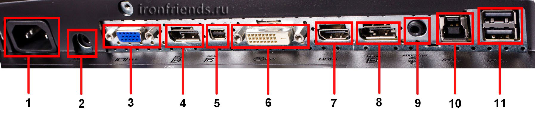 1. Разъем питания 220 В.2. Разъем питания для мониторов с внешним блоком питания или питания колонок.3. Разъем VGA (D-SUB) для подключения к компьютеру со старой видеокартой. Не является обязательным, так как для этого можно использовать переходник.4,8. Разъемы Display Port для подключение к современной видеокарте. Поддерживают высокое разрешение и частоту обновления более 60 Гц (для игровых и 3D мониторов). Не являются обязательными если есть DVI и монитор не поддерживает частоту более 60 Гц.5. Разъем Mini Display Port такой же разъем меньшего формата, не обязателен.6. Разъем DVI для подключения к компьютеру с современной видеокартой. Должен быть обязательно если нет других цифровых разъемов (Display Port, HDMI).7. Разъем HDMI для подключения компьютера, ноутбука, ТВ-тюнера и других устройств, желательно наличие такого разъема.9. Аудио разъем 3,5 мм для подключения звука к мониторам со встроенными динамиками, внешних колонок или наушников, не обязателен, но в некоторых случаях такое решение может быть удобным.10. Разъем USB для подключения встроенного в монитор USB концентратора, есть не везде и не является обязательным.11. Разъемы USB в мониторах с USB концентратором для подключения флешек, мышки, клавиатуры и других устройств, не являются обязательными, но в некоторых случаях это может быть удобно.