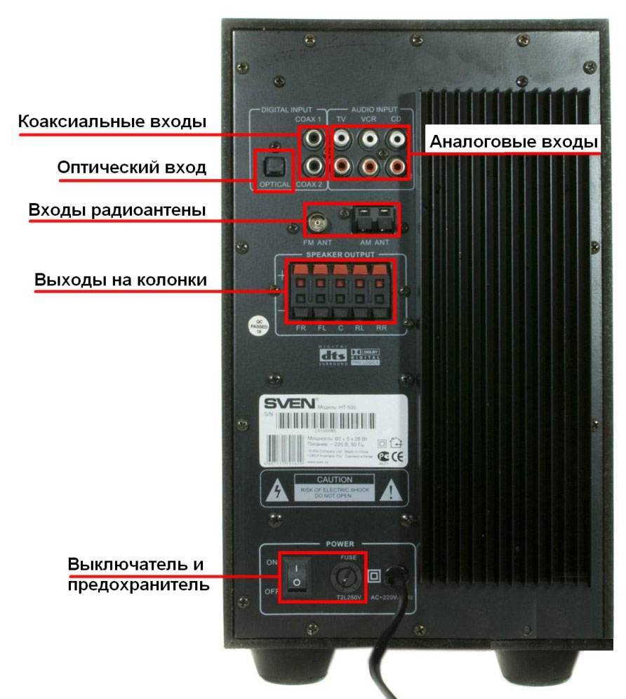 Так же система может иметь коаксиальный и оптический разъемы, с помощью которых можно подключить как компьютер, так и видеопроигрыватель, имеющие аналогичные разъемы.