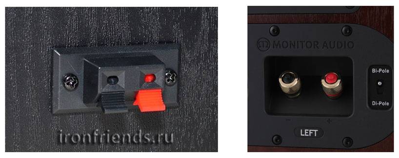 Все колонки так же имеют разъемы и соответствующие кабели для соединения с усилителем, который встроен либо в одну из колонок (в системе 2.0), либо в сабвуфер (в системах 2.1, 5.1). Вместо тюльпанов для всех или некоторых соединений колонки могут иметь пружинные или винтовые разъемы, в которые провода вставляются напрямую.
