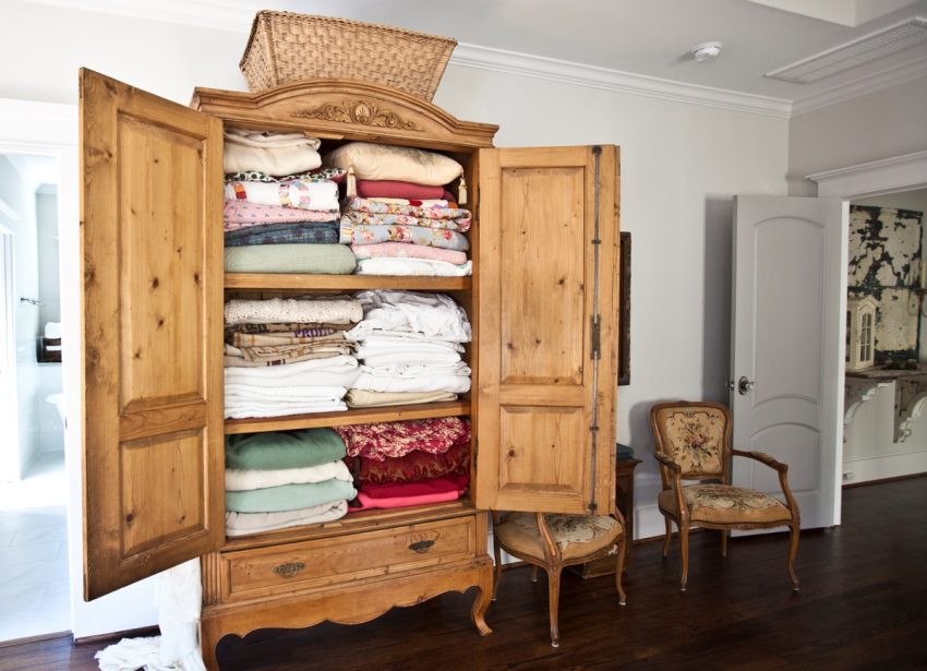 Французский прованс. Гардероб можно украсить тематическим узором. Цвета света: от белого до голубого и серого. Двери могут быть стеклянными или заменить занавеской в деревенском стиле. Поверхности искусственно состарены, фурнитура кажется изношенной.