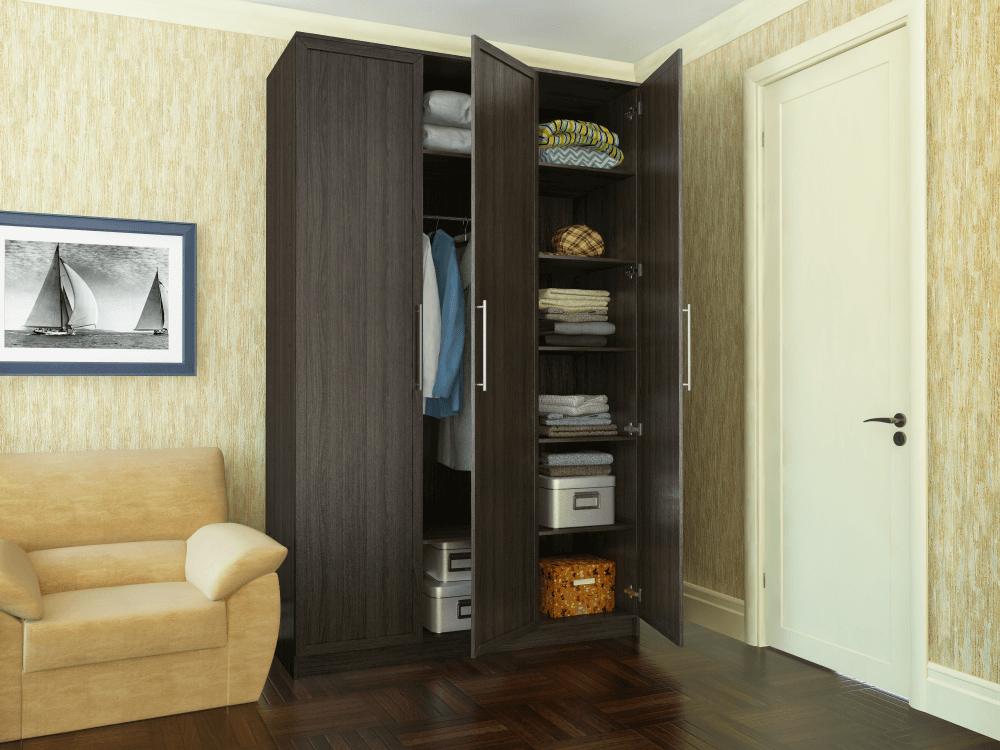 Распашные типы шкафов являются традиционными для спален. Такие конструкции представляют собой из двух дверей, за ними скрываются пеналы со многими секциями. Модели, имеющие оснащение трех или четырех дверей, более вместительны. Дверцы в них крепятся при помощи петель, благодаря чему экономится дорогостоящая система направляющих, которые используют, чтобы изготовить копейные конструкции.